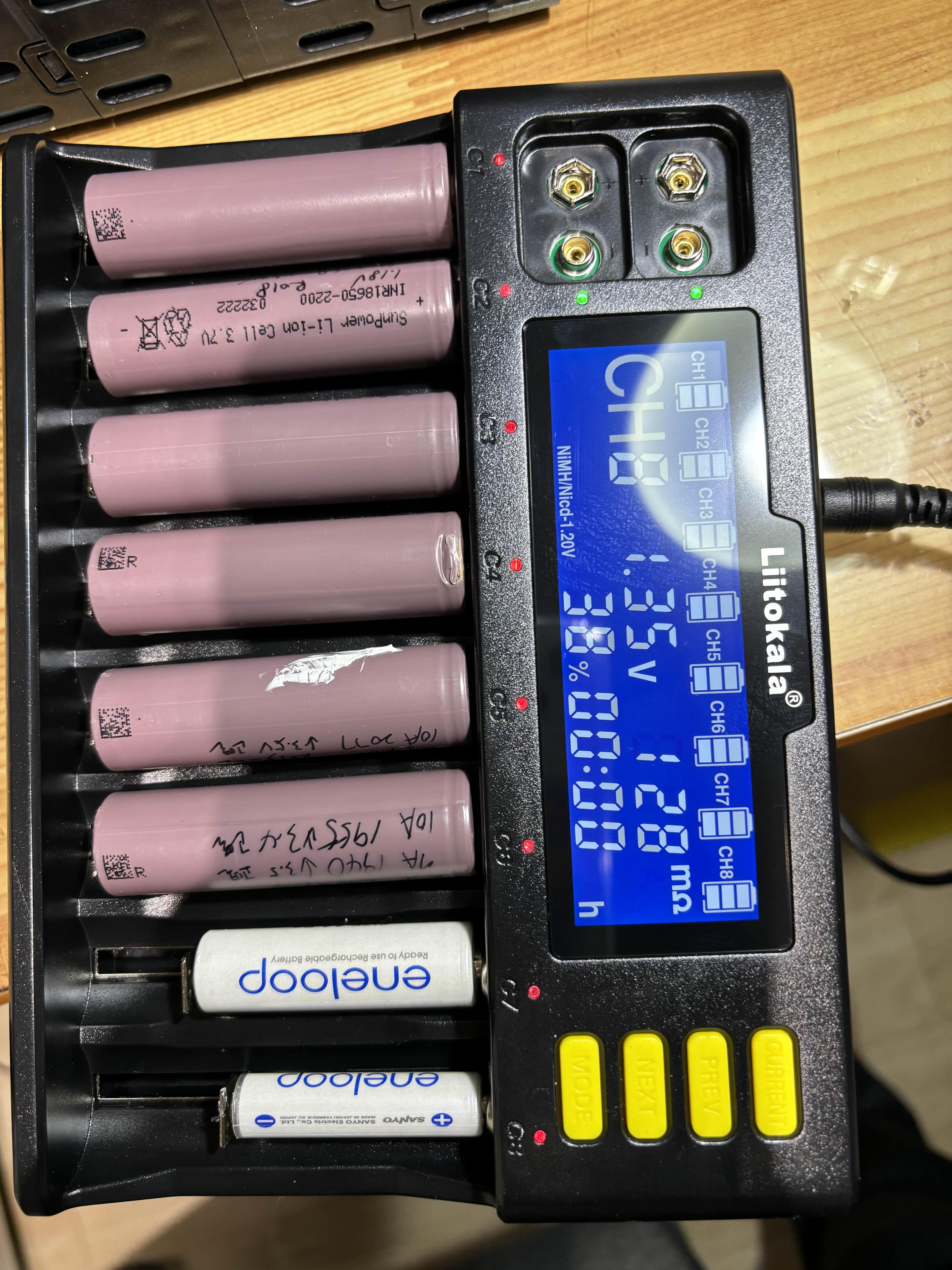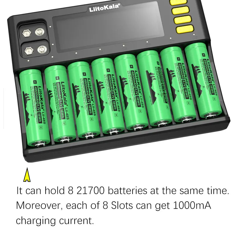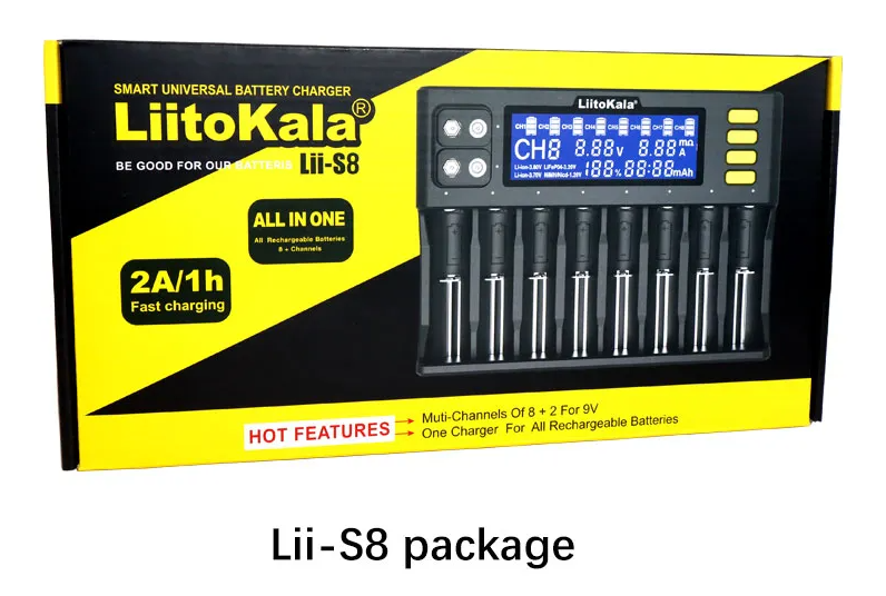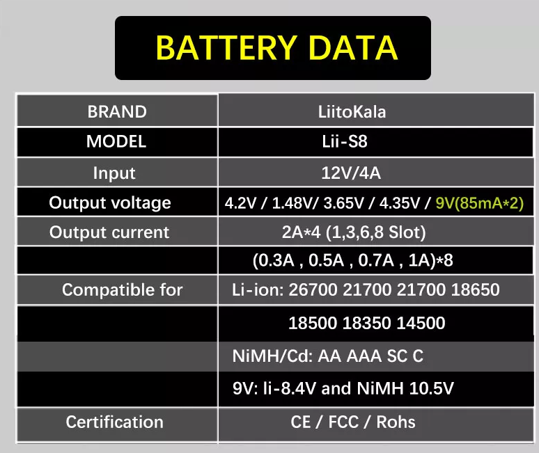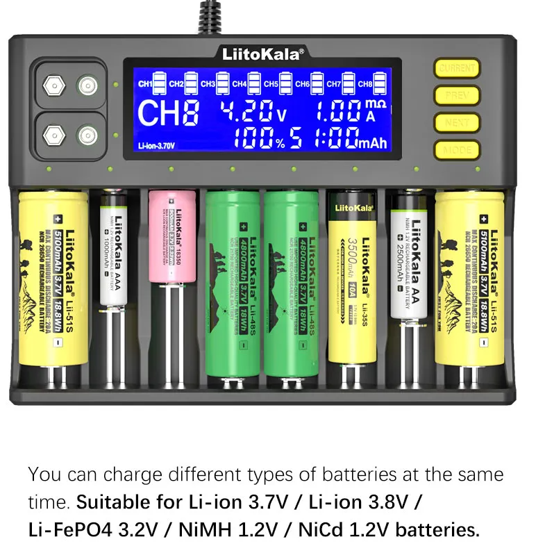 Li-ion / IMR/LiFePO4: 26650,21700,20700, 18650, 18490, 18350, 17670, 17500, 16340(RCR123), 14500, 10440 ,9V
